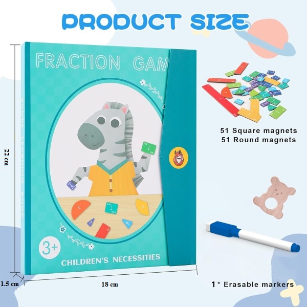 Vključuje 9 barvitih magnetnih krogov in pravokotnikov, ki olajšajo predstavljanje in razumevanje ulomkov.